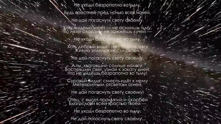 не уходи безропотно во тьму будь яростней пред ночью всех ночей не дай погаснуть свету своему. не уходи безропотно во тьму. хоть мудрый знает не осилишь тьму во мгле словами не зажжёшь лучей не уходи безропотно во тьму хоть добрый видит. не уходи безропотно во тьму будь яростней пред ночью всех ночей не дай погаснуть свету своему.